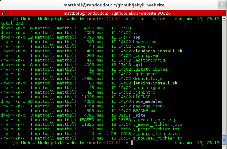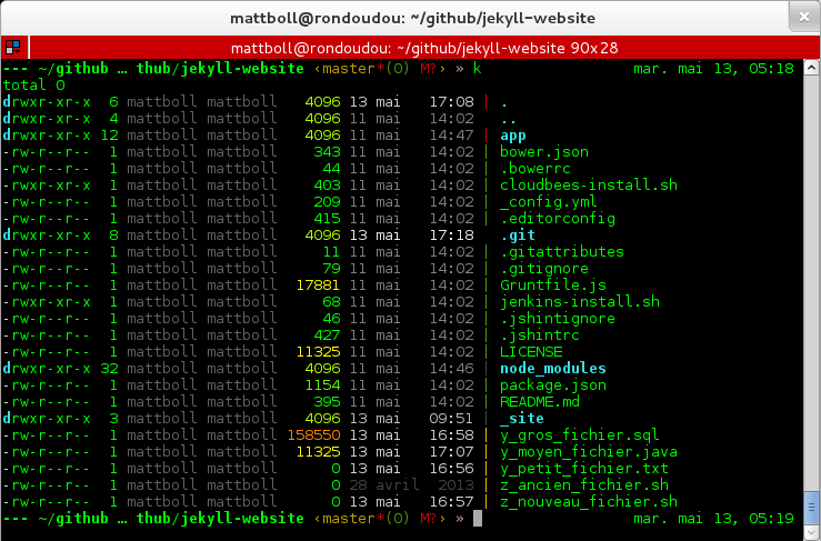 k est disponible uniquement pour zsh. Pour l’installer, il suffit de cloner le dépôt git et d’ajouter source ~/path/k/k.sh dans son ~/.zshrc.