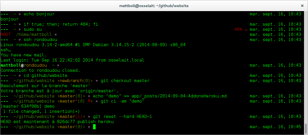 /home/mattboll/workspace/projetSecret/java/com/codetroopers/projetxx/machin/beanil me suffit de lire~/.../machin/beanpour savoir où je suis et ça permet de toujours avoir un prompt de taille raisonnable, c’est plus agréable. - des infos git : sur quelle branche je suis, est-ce que je suis synchro, est-ce que je dois merger, combien j’ai de commits en attente d’être pushé etc.