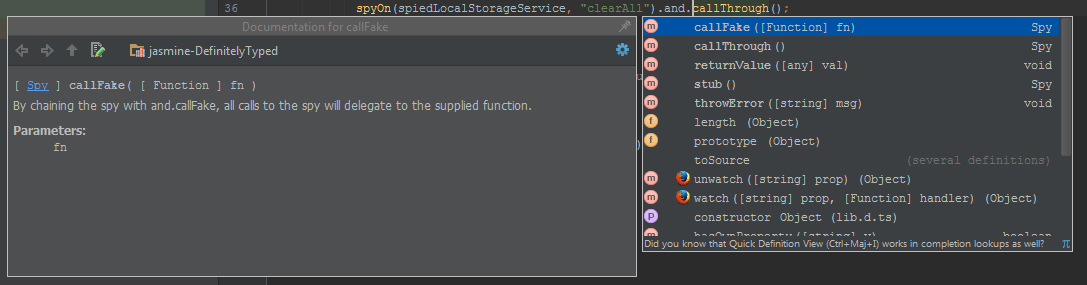 Avec ceci, vous aurez une complétion efficace, avec le typage offert par TypeScript (dans la mesure du possible), ainsi qu’une documentation précise (pour la plupart des librairies).
