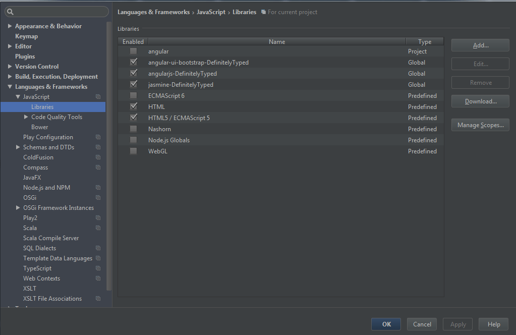 - pour les versions minifiées, vous pouvez ajouter manuellement les bibliothèques dans la fenêtre de paramètres (Languages & Frameworks > JavaScript > Libraries)