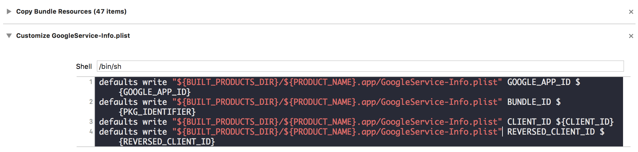 defaults write "${BUILT_PRODUCTS_DIR}/${PRODUCT_NAME}.app/GoogleService-Info.plist" REVERSED_CLIENT_ID ${REVERSED_CLIENT_ID}