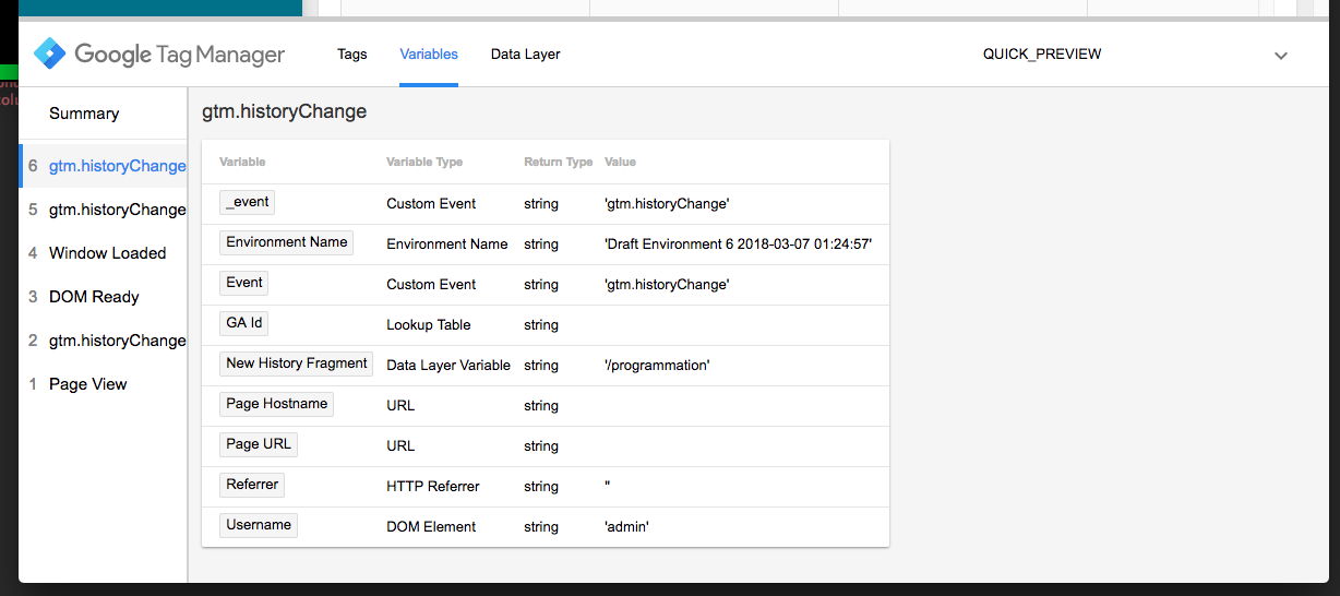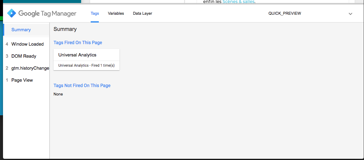 Dans le panel de debug, vous verrez normalemement la liste des différents déclencheurs sur la gauche, et lorsque vous cliquez dessus, vous pouvez voir quelles balises ont été activées et dans l’onglet Variables, la valeur des différentes variables (dont votre New History Fragment).