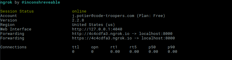Une fois ngrok installé il est ensuite possible de monter une url publique vers notre serveur local en une seule commande :