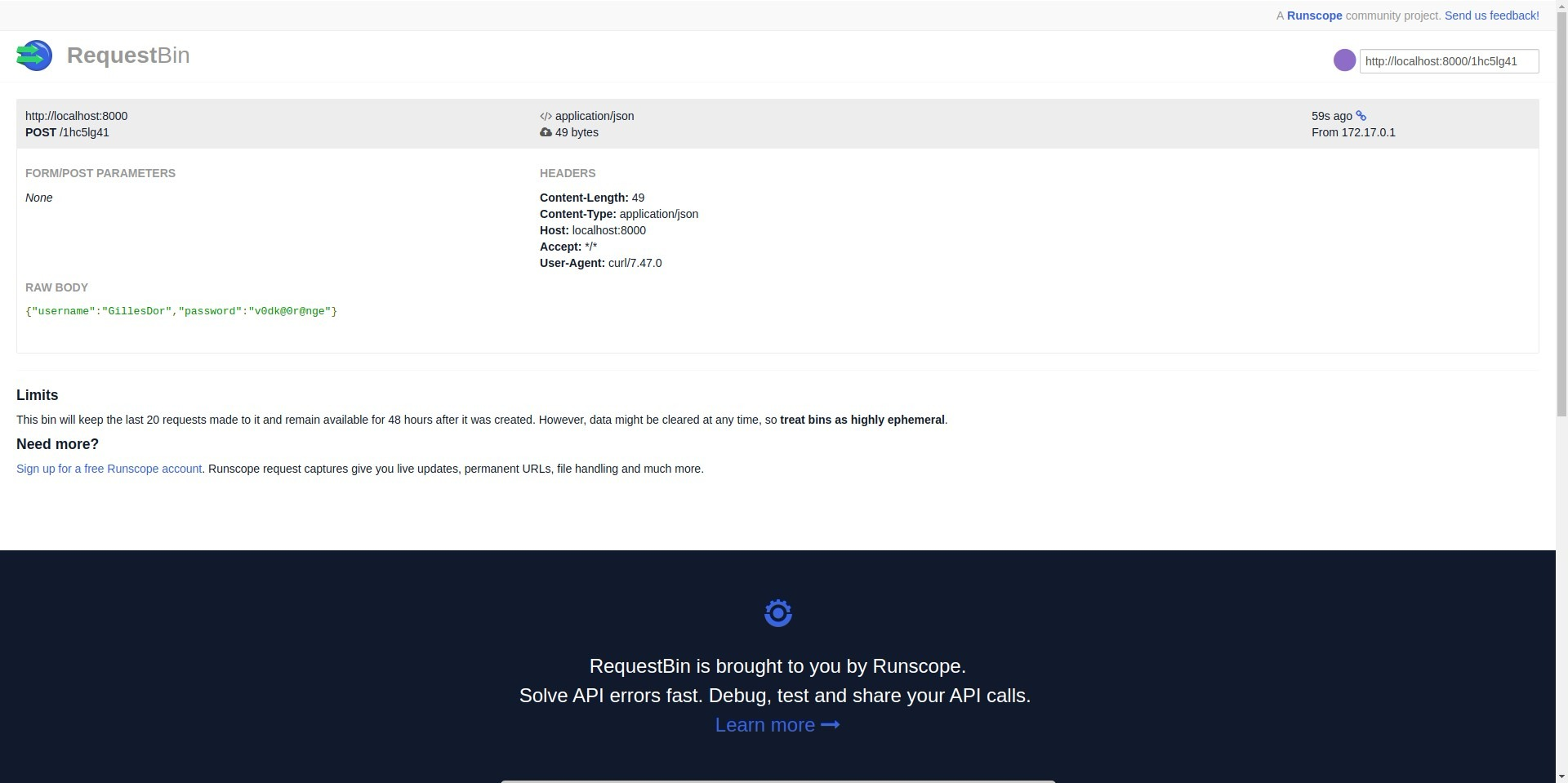 $ curl -H "Content-Type: application/json" -d '{"username":"GillesDor","password":"v0dk@0r@nge"}' http://localhost:8000/1hc5lg41