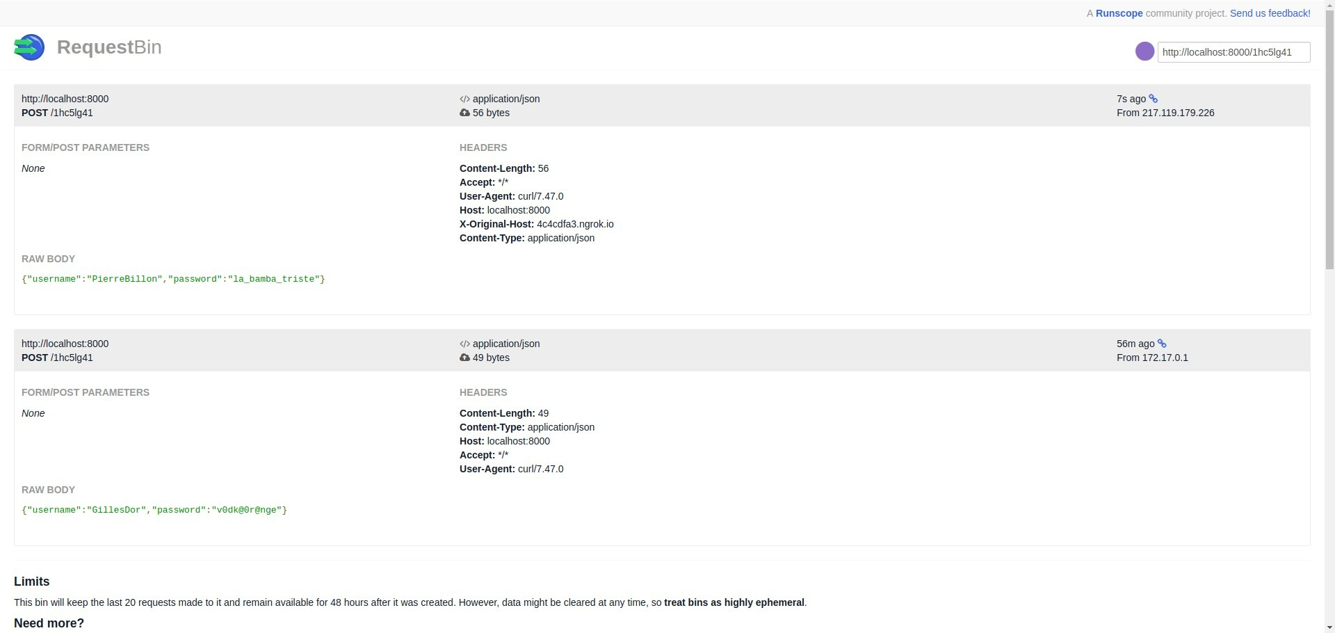 $ curl -H "Content-Type: application/json" -d '{"username":"PierreBillon","password":"la_bamba_triste"}' https://4c4cdfa3.ngrok.io/1hc5lg41